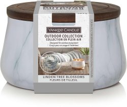 Candela con giara media da esterno di Yankee Candle della collezione outdoor candle. La candela è realizzata con metallo e legno ed è di colore verde chiaro. Alle tue serate all'esterno porta un tocco di ninfea, glicine, profumi di fiori di tiglio. La fragranza principale linden tree blossoms.