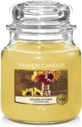 Candela classica con giara media di Yankee Candle della collezione fall in love with yc. La candela è realizzata con cera e vetro ed è di colore giallo. Riempi la tua casa con profumi di fiori d'autunno con note di zenzero e vetiver. La fragranza principale golden autumn con note di testa: seme di girasole, zensero caldo, agrumi frizzanti. Note di cuore: red mums, astro rosso, dahlia. Note di fondo: patchouli, vetiver, muschio.